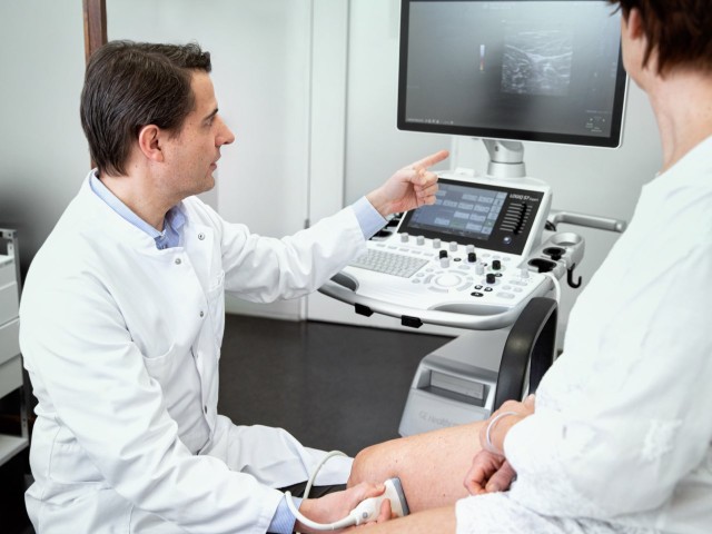 Vor der Behandlung erfolgt eine detaillierte Untersuchung in unserem Venenzentrum. Mithilfe von Ultraschall werden die betroffenen Gefäße genau lokalisiert, um eine präzise Injektion zu gewährleisten.